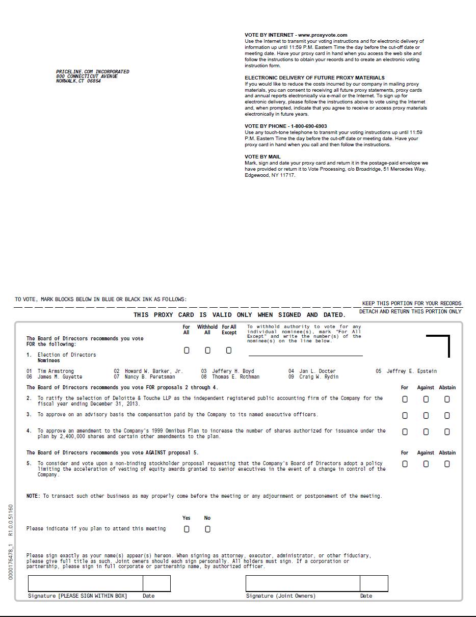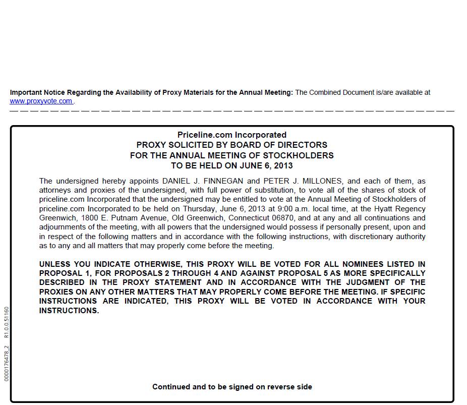 You are cordially invited to attend the 2013 Annual Meeting of Stockholders (the "Annual Meeting") of priceline.com Incorporated to be held at 9:00 a.m. on Thursday, June 6, 2013 at the Hyatt Regency Greenwich, 1800 E. Putnam Avenue, Old Greenwich, Connecticut 06870.